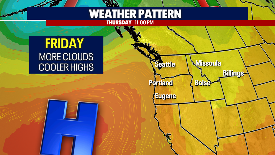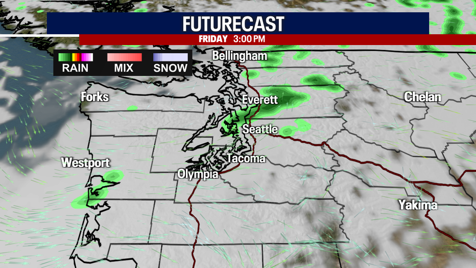 Clouds continue to push inland Friday for an overcast day and by late afternoon/early evening, we expect a few light showers to roll across the Sound.