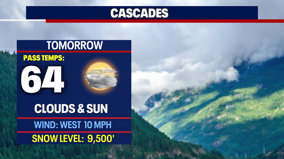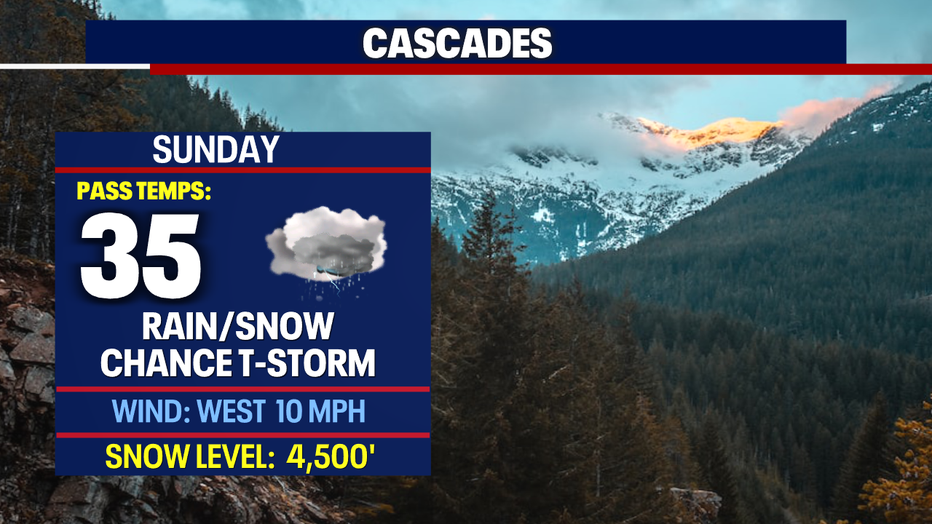 Snow levels Sunday will fall to near 4,500' for the Cascades with rain and snow possible with a slight chance for afternoon thunderstorms. Highs land near 35. Brr!