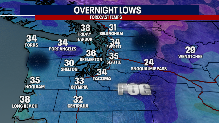Early Thursday and Friday mornings, there could be spotty fog or even freezing fog. Where this happens, there could be slick spots. If you're a homeowner or business owner in the South Sound, I'd make sure to start regularly treating your sidewalks and pavement – unfortunately, ‘tis the season for icy spots. Even for communities without fog the next few mornings, it’ll still be frosty. Carve out time in your morning routine to scrape the windshield.