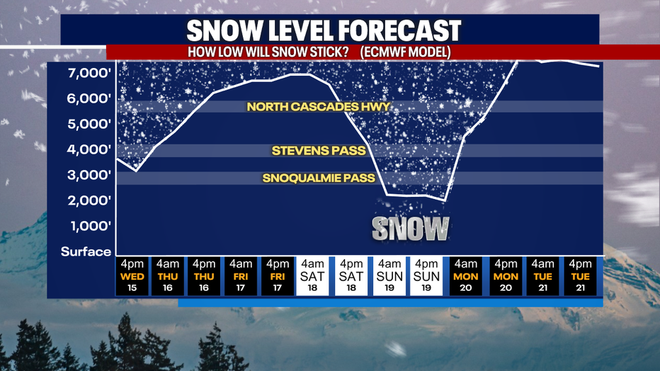 Snow levels stay elevated with mildish weather on Friday, but snow levels plunge into Sunday after Saturday's cold front. Several inches of snow could accumulate over the passes by the second half of the weekend. Stay tuned because there's still some uncertainty about how much snow could fall.