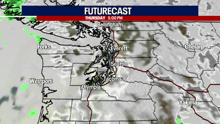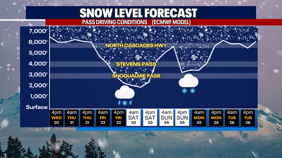 Our next frontal system will bring in lowland showers Friday morning through Saturday morning, along with a few snowflakes in the mountain passes. The snow levels will drop a bit late Friday night and then again Sunday night.