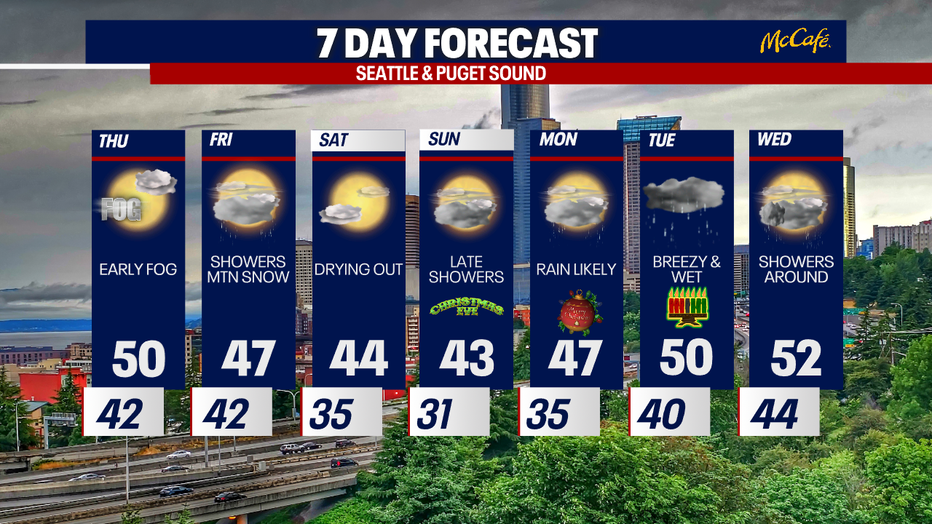 Fog will be dense through the morning hours Thursday. There will also be a weak system passing to our north that may clip the northern part of our area, so a few sprinkles are possible in Whatcom County.