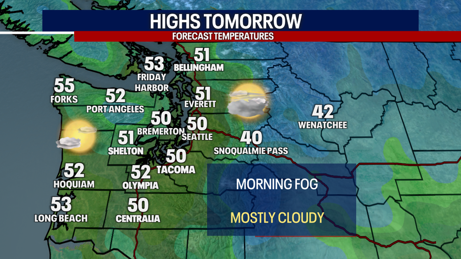 We could see some spots staying cloudy all day as the morning fog will be tough to burn off again. Clouds will also stream in ahead of our next frontal system, so any sunshine will limited.