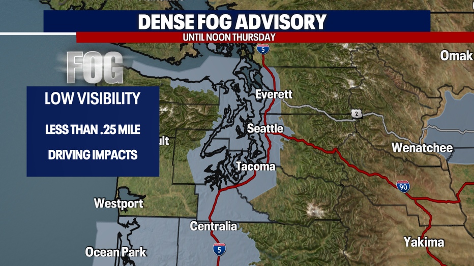 Another round of dense fog tonight for Western Washington. A Dense Fog Advisory in effect again tonight through noon Thursday for most of the Puget Sound lowlands.