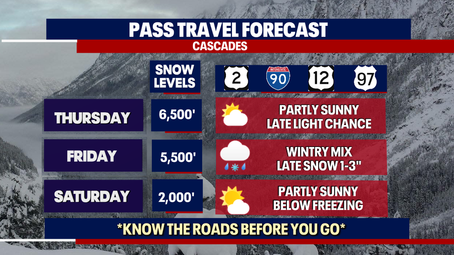 The passes will remain dry Thursday for travel, with a slight chance of wintry precip late Thursday. Precipitation will be a wintry mix through Friday afternoon for the Cascade mountain passes, changing over to snow for later in the night. Dry conditions again Saturday.