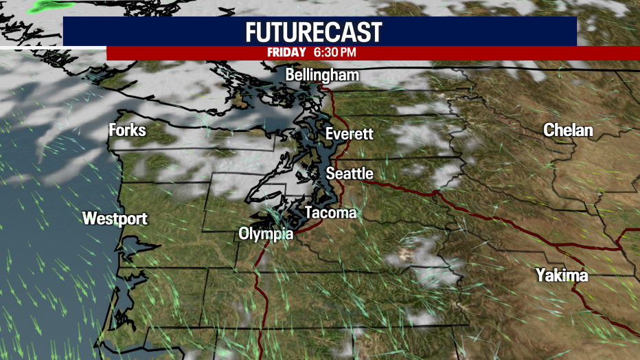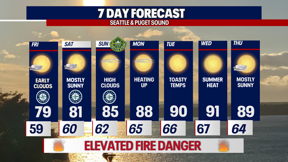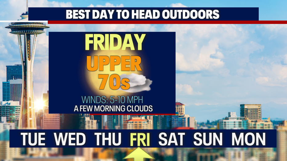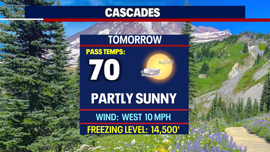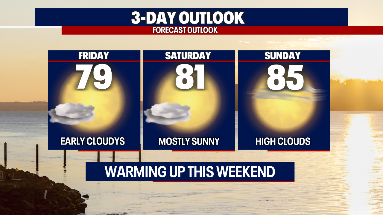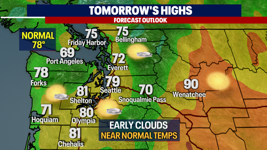 Folks who live in the North Sound will see slightly cooler highs in the low to mid-70s while South Sounders heat into the low 80s.