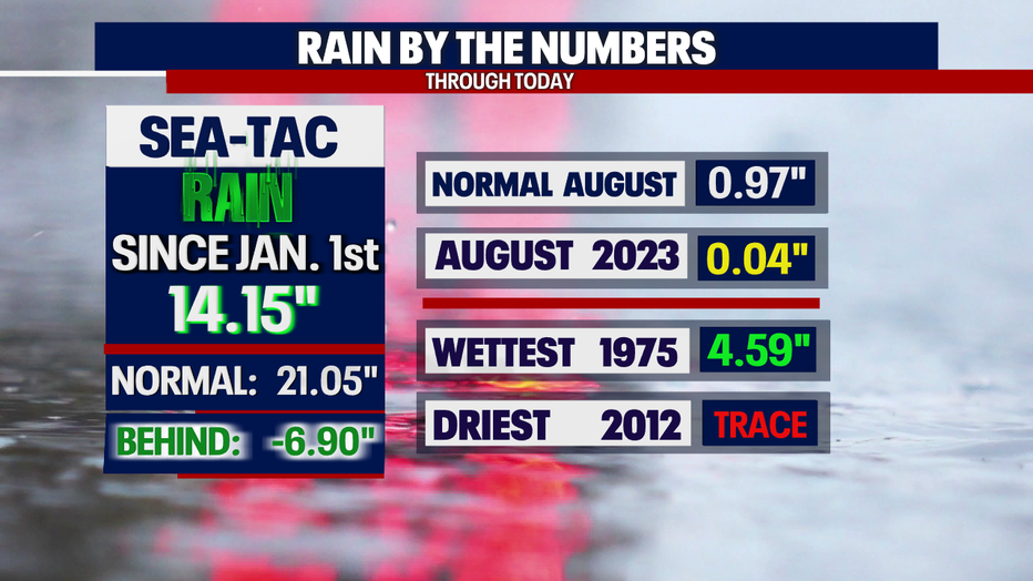 As high pressure continues to build just offshore, we're forecasting a significant warm-up. This will increase the risk of fire danger across the Pacific Northwest. Please be aware of your surroundings as our grounds are very tinder dry. So far this month we've only seen 0.04" in the bucket at SeaTac. Normal for the month of August is 0.97".