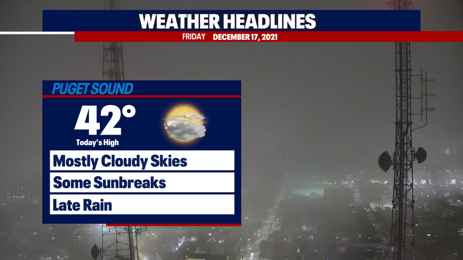 It's a foggy start to Friday in some areas of Western Washington, especially in the central and south Puget Sound areas. This afternoon will feature mostly cloudy skies with a few sunbreaks. Widespread rain hits late tonight.