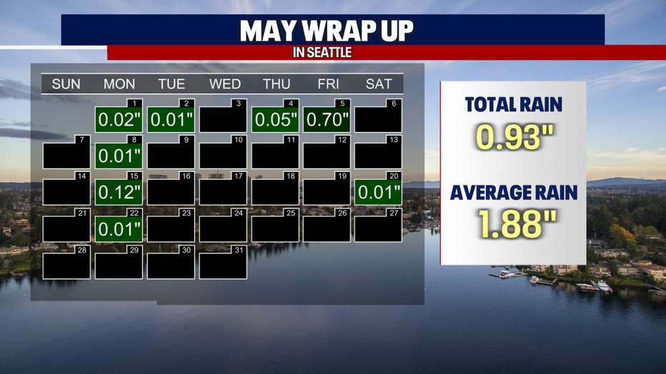 This was officially the 2nd warmest May on record in Seattle with an average temperature of 60.9°. This number takes the average of our highs and lows for the month. May 2018 still holds the top spot with an average temperature of 61.2°.
