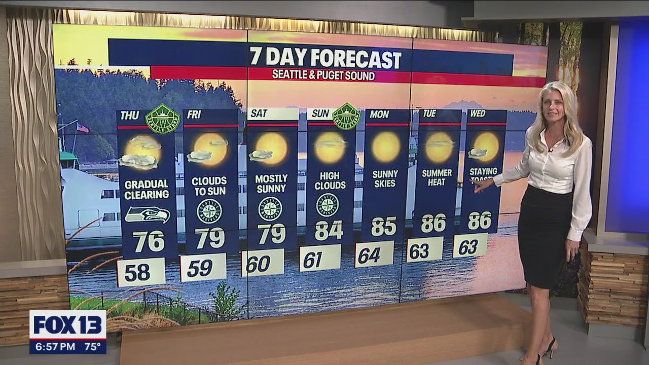 Highs land in the low 70s to the north with mid to upper 70s Seattle south.