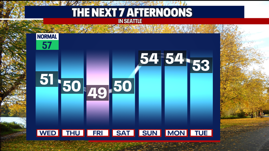 A cold, dry air mass will linger over the Pacific Northwest over the next week. High temperatures will remain cool, five to ten degrees below average.
