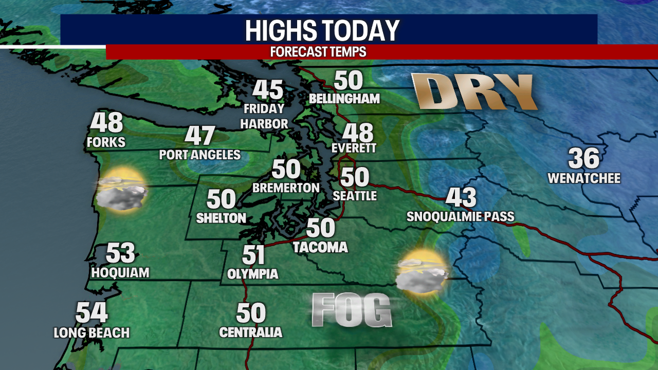 Patches of low-hanging clouds and fog are clearing this morning. Otherwise, we're tracking partly sunny skies and dry weather. Today will be perfect for heading to the playground with the kiddos and getting the dog outside for a walk.
