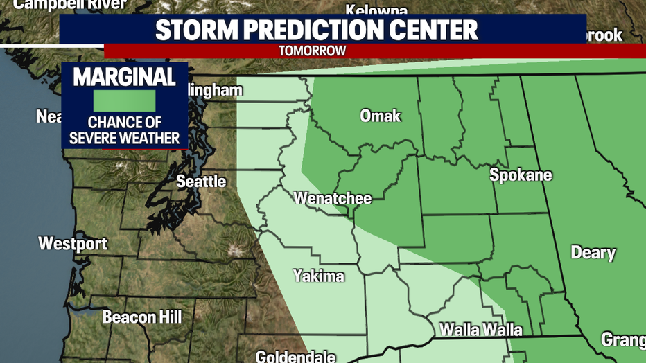 The clouds will remain thick along the coast, break across the Puget Sound (afternoon sunshine) and we can expect an isolated storm in the cascades. Most of the thunderstorm activity will take place across the Central and Eastern Washington. There will be a marginal risk of severe weather possible in the area so be aware if you're planning on being in the location highlighted below: