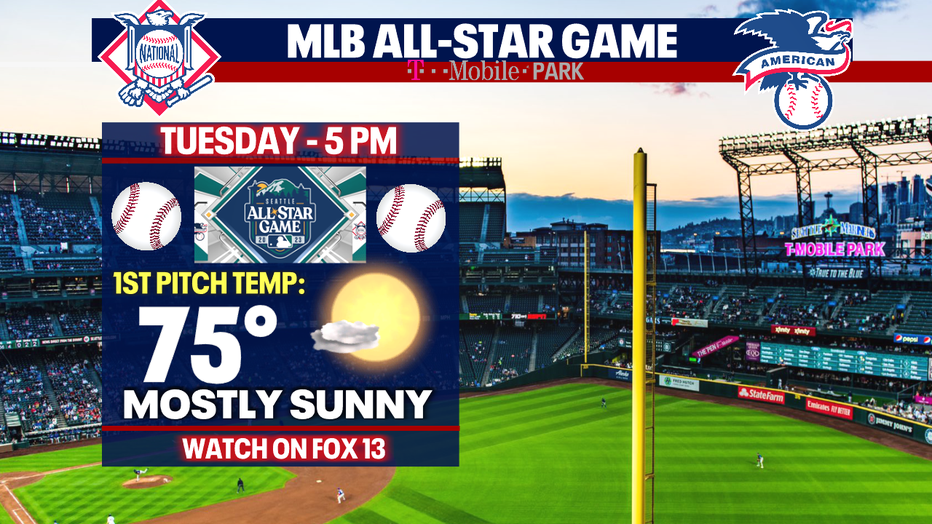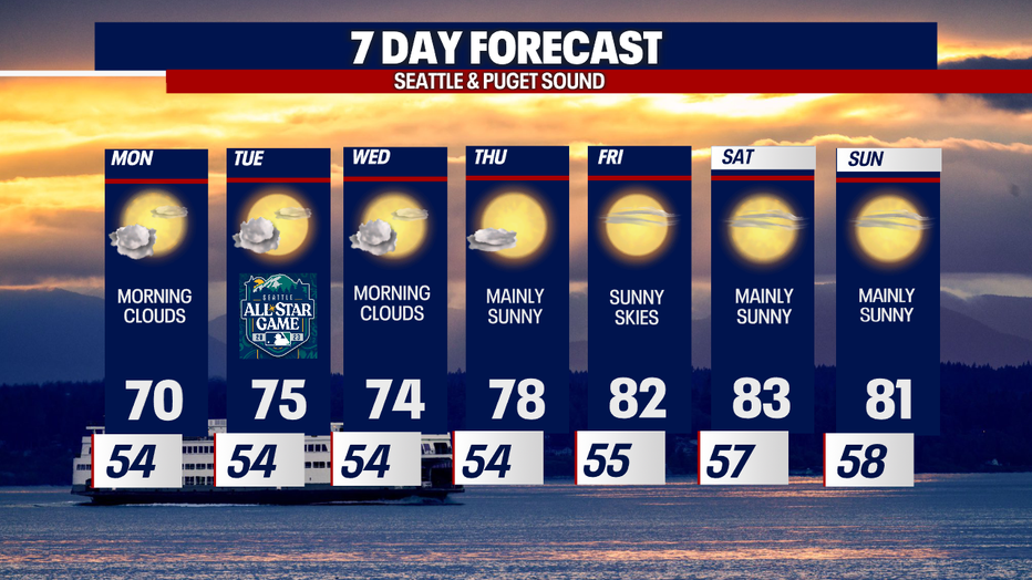 Western Washington will remain free of severe weather and thunderstorms. We'll continue with gray mornings and sunny afternoons! For those heading to the All-Star Game - here is a look at your forecast: