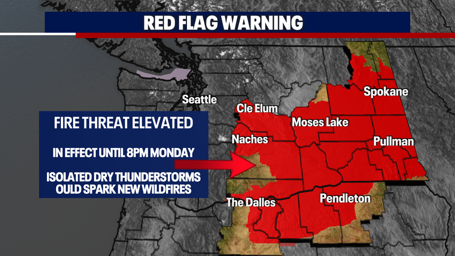 Due to the thunderstorm chances - A *Red Flag Warning* will be in effect until 8pm Monday night. The biggest threat will be a dry lightning strike that could potentially spark a new wildfire.