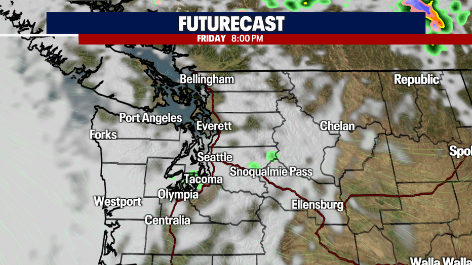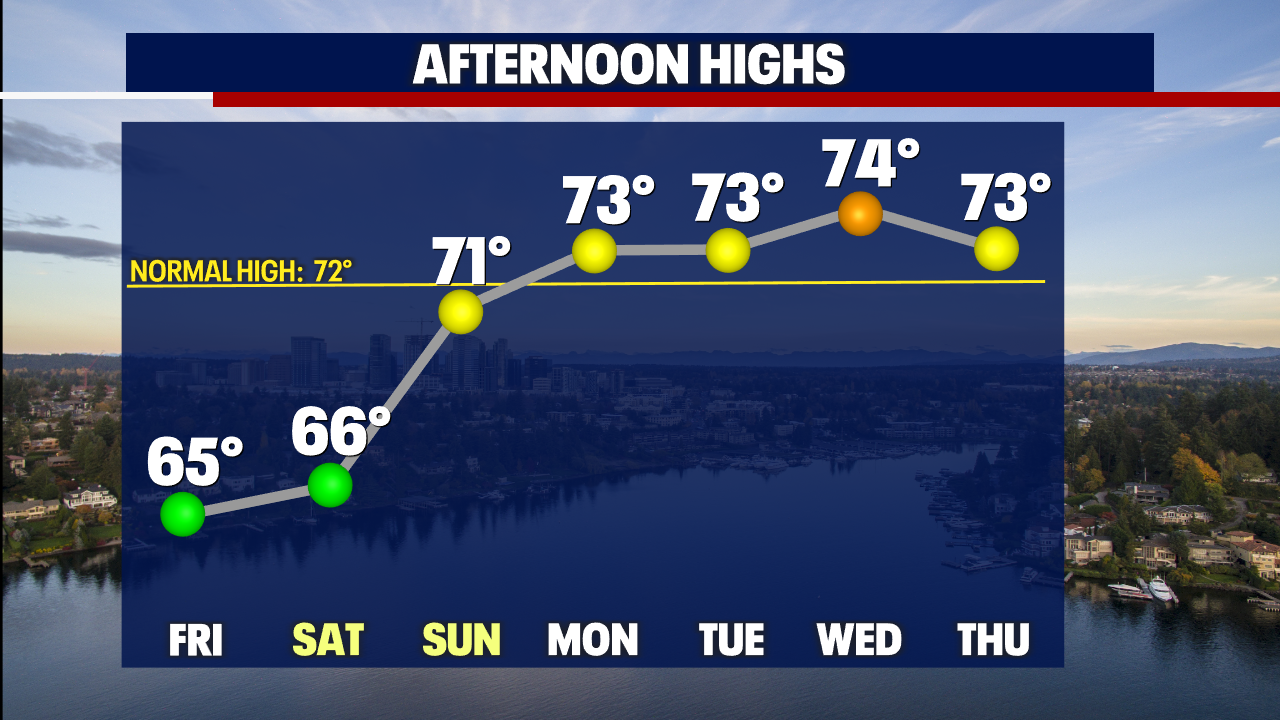 Seattle - Hello cooler weather! Temperatures will be 7 degrees below normal (72) as a new system arrives. This will not only cooler temperatures but spotty showers, and cloudy skies.