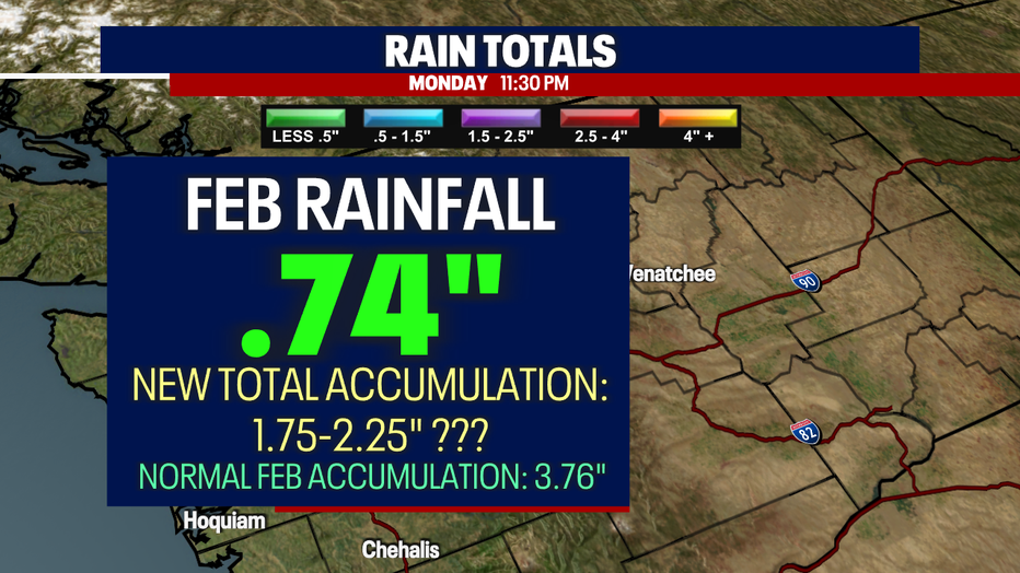 Rain accumulation will range between 1-1.5" to finish off the month of February (Monday night). That will be helpful! However, it still looks like we'll end the month with below average rain totals