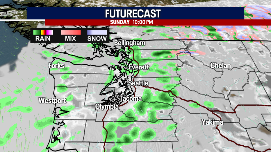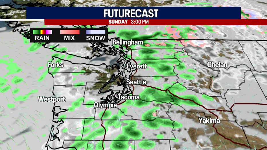 SEATTLE - After another soaking day Saturday, far fewer showers are on tap for today. Monday will be drier (but still cloudy).