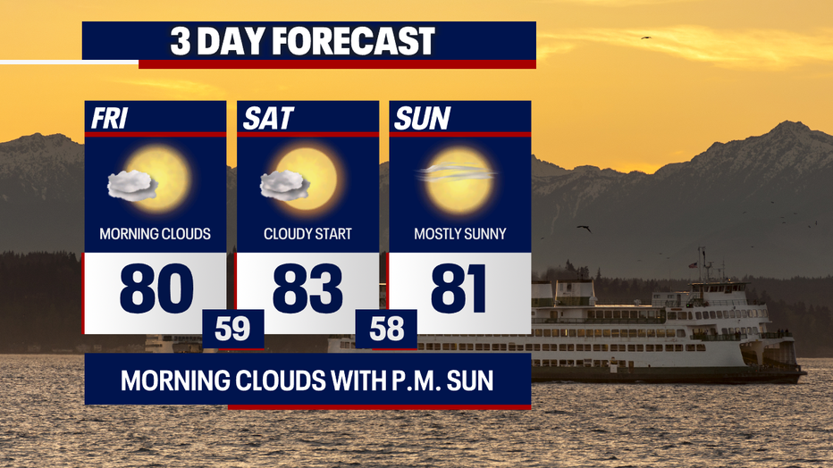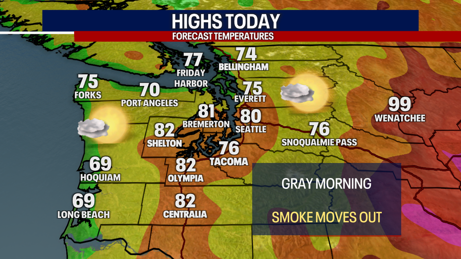 Once the clouds clear today, we're forecasting highs in the mid 70s to low 80s with beautiful afternoon sunshine. There will be less smoke today, and that's because westerly winds will help push leftover haze out of Western Washington. We're expecting good air quality.
