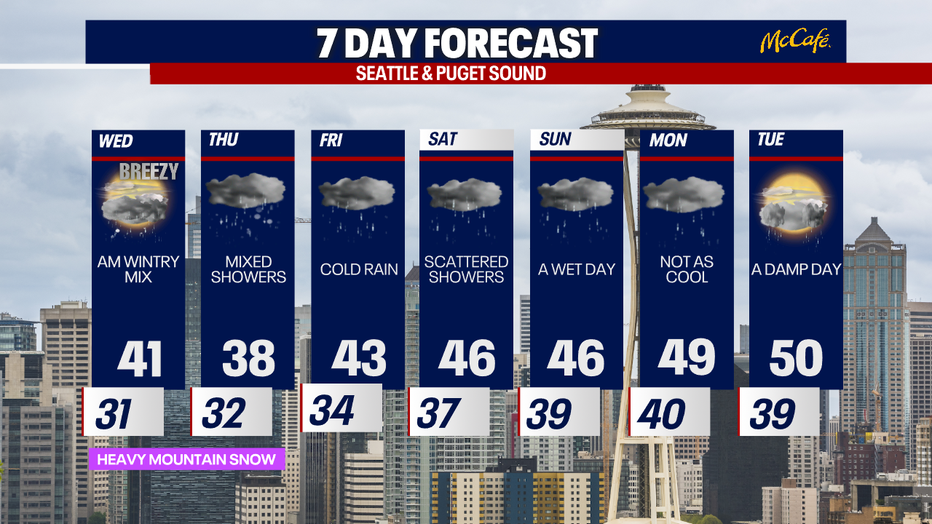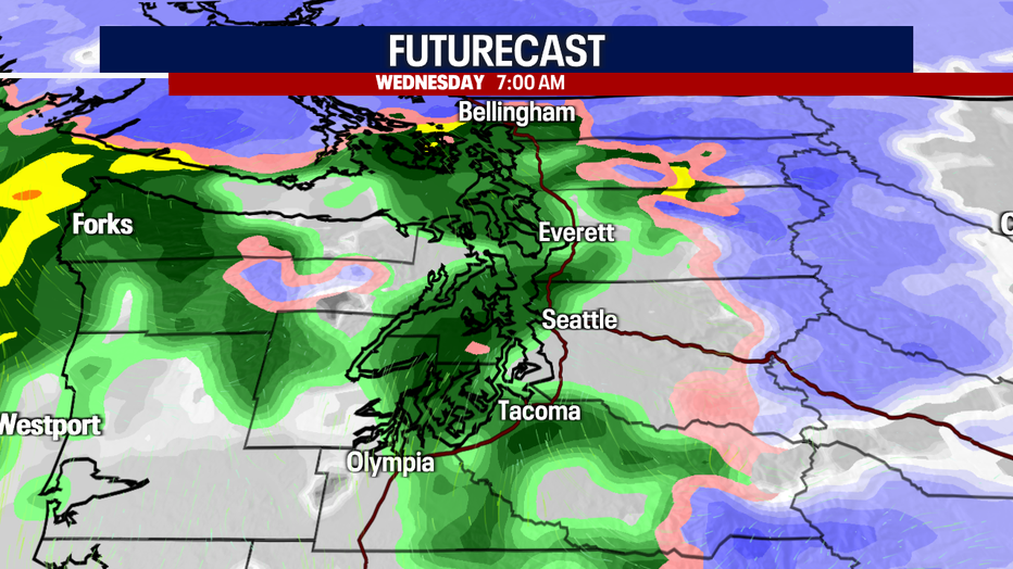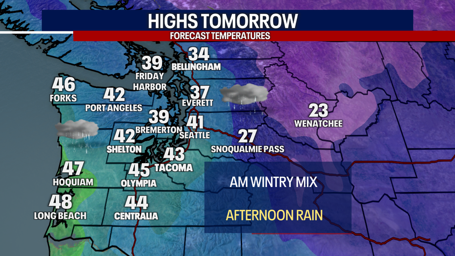 By tomorrow morning, most of the showers will be just rain. A few mixed showers can't be ruled out. Snow is still likely up north near Whatcom County and the Strait.