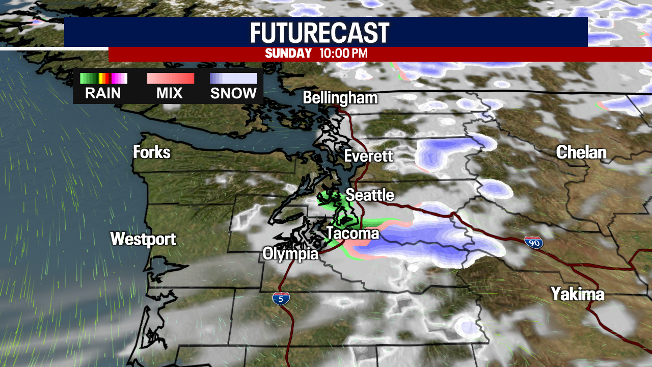 Light snow fell at times in the mountains with two to six inches of accumulation expected in general. By late Sunday night, a convergence zone was forecast to take shape, producing a few localized showers in select areas of Central Puget Sound and the Cascades.