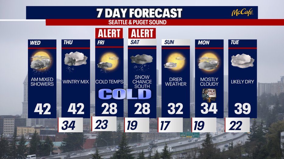Seattle - A few lingering showers will impact the Puget Sound area through Wednesday afternoon, while Western Washington braces for frigid days ahead.