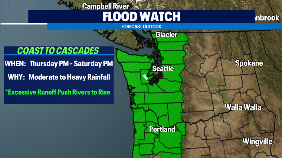 A "Flood Watch" goes into effect Thursday afternoon lasting through Saturday afternoon from the Coast to the Cascades along with most of NW Oregon.