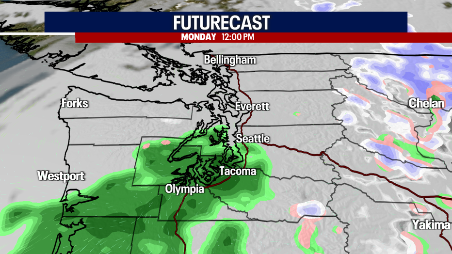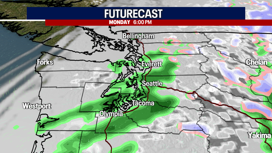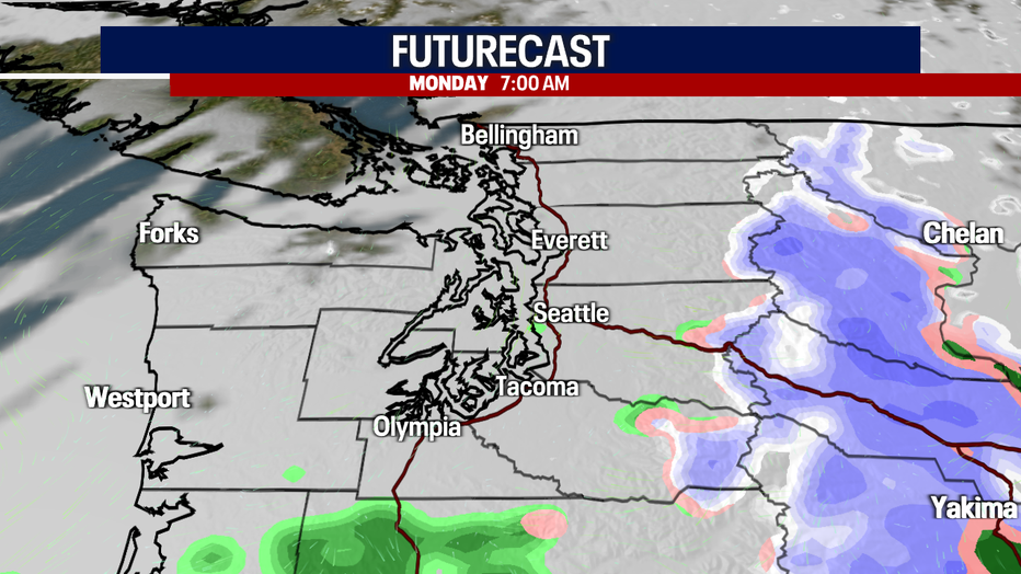 Monday, isolated to scattered showers return to Western Washington, moving in from the south. Light snow showers are possible along the eastern slopes of the Cascades. Some of the communities near the Cascades (for example, North Bend and Enumclaw) could be windy tomorrow. Gusts could reach 30-40 mph.