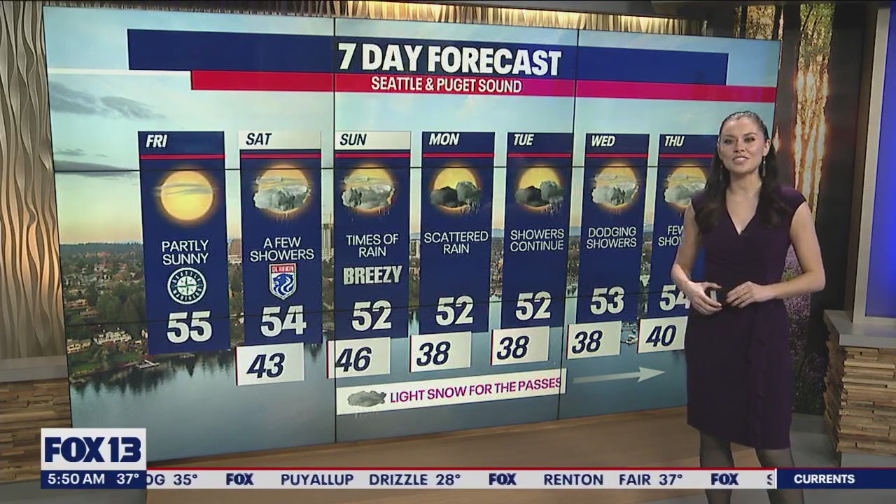 Saturday morning will start cloudy and dry, but scattered showers return in the afternoon. If you're heading to catch the OL Reign or Mariners game, dress in warm and waterproof layers.