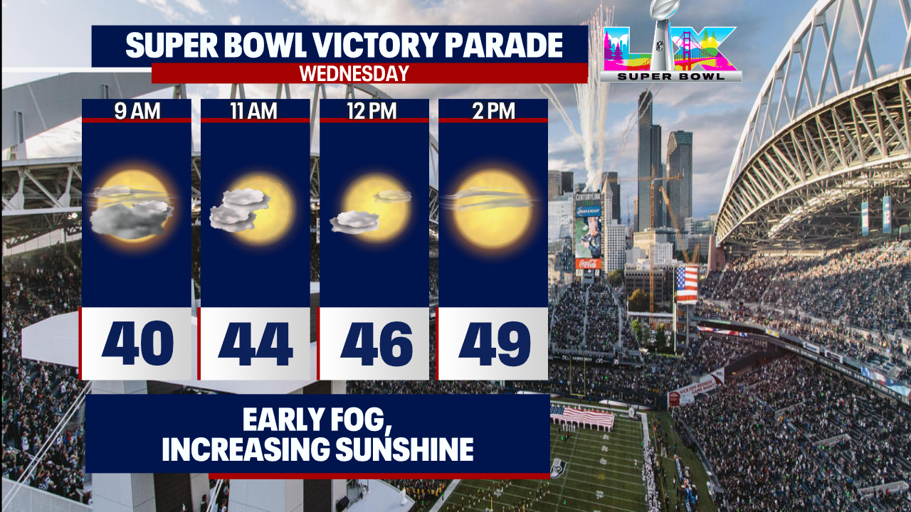 It will be cloudy to start the early morning festivities, but the skies should clear heading into the parade through downtown Seattle. (FOX 13 Seattle)