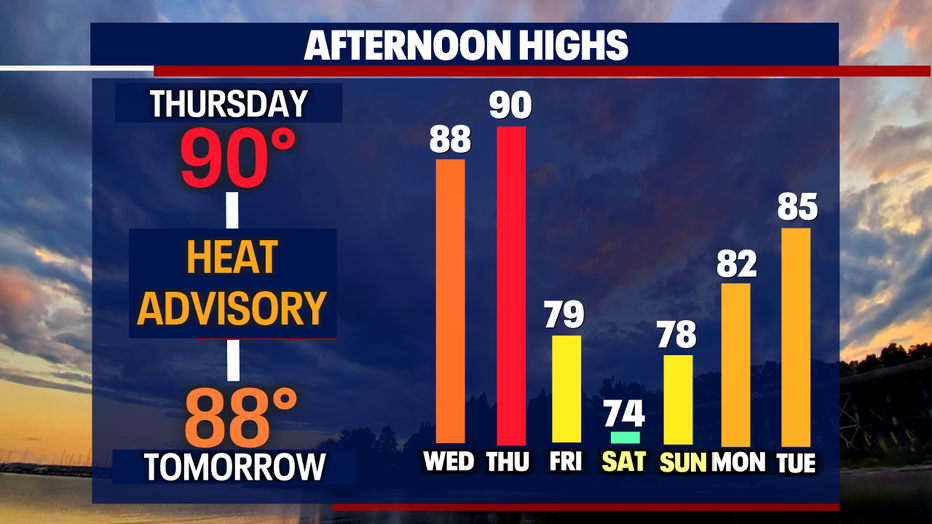 A Heat Advisory will go into effect Wednesday afternoon and will remain in place until midnight on Thursday. Temperatures will range between the mid-80s (North Sound) to the low-90s (South Sound).