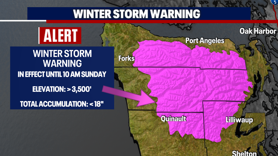 A Winter Storm Warning is in place for the Olympics until 10am tomorrow with the possibility of up to 18" of snow accumulation.