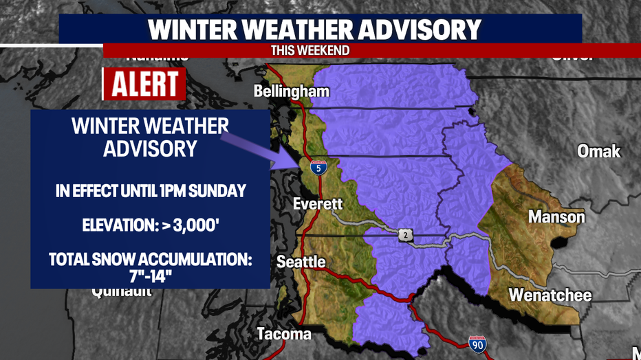 A Winter Weather Advisory will remain in place until 1pm tomorrow afternoon for parts of the Cascades. (9:45pm) Chains are required for those travel through Snoqualmie Pass right now so check in on those road conditions before traveling.