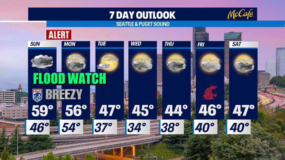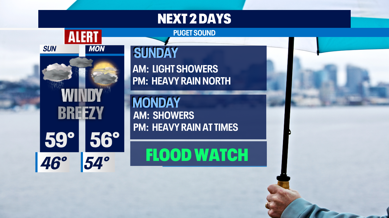 SEATTLE - After a mostly quiet Saturday we're now seeing the start of another atmospheric river pump in more rain and wind throughout the region. Get ready for round two as conditions will become pretty sloppy at times Sunday into Monday.