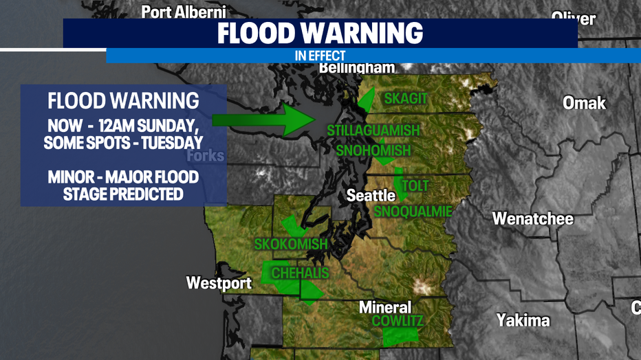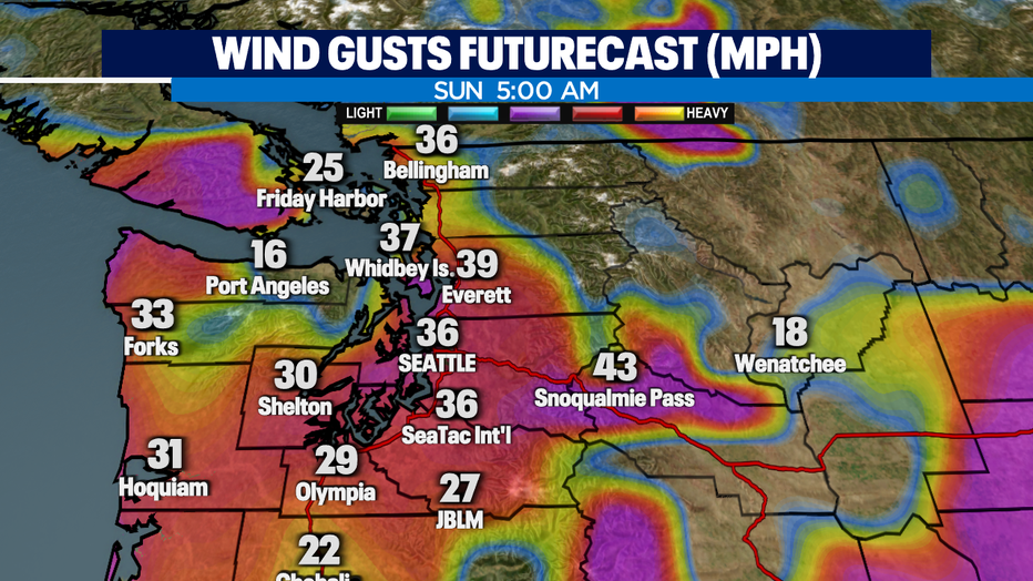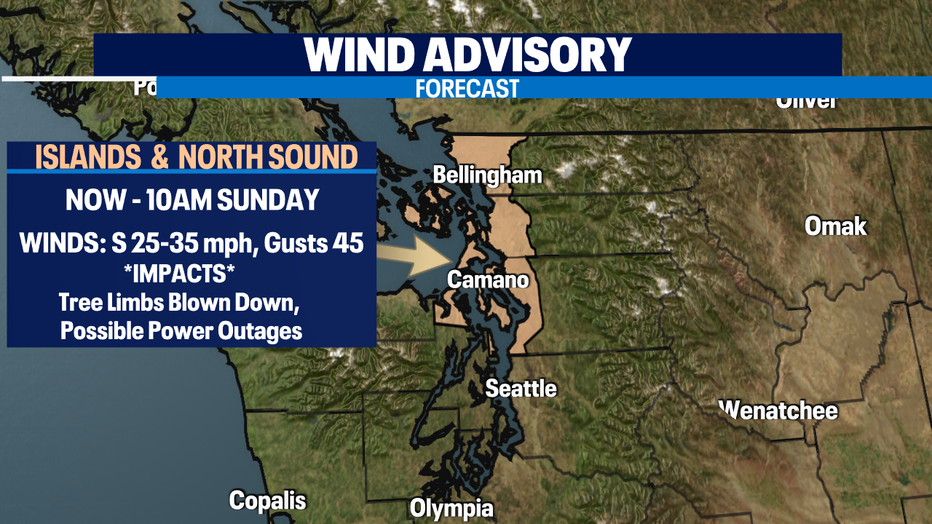 And it's not just the rain we are dealing with as this atmospheric river hits the area, we're also seeing some good gusts too. Winds in most spots will be breezy, but several counties to the north will see winds gust up to 45mph at times and that is why we have a "Wind Advisory" in effect through 10am Sunday. Areas affected are the Islands, Western Whatcom, Skagit, and Snohomish Counties.
