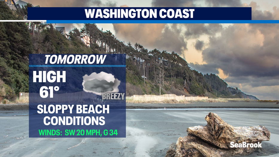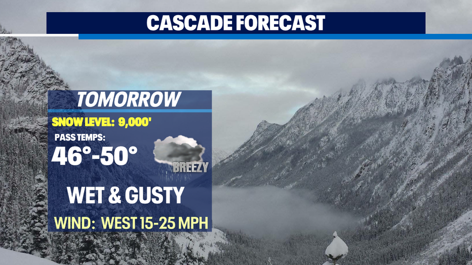 Overnight look for showers to pick up, especially over the mountains where snow levels will rise to near 9,500'. The Cascades could see 1-3" of rain making for some slick roads. Also, making travel a bit tricky are the winds that will gust at times to near 25mph.