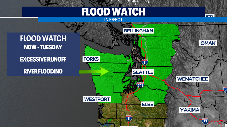 With so much rain falling over the mountains an excessive amount of water will be flowing down into the lowlands where area rivers, streams, and creeks will rise rapidly, so this why we have a "Flood Watch" in effect through Tuesday. Please allow extra time when driving around the area as roadways will pool a decent amount of water creating ponding. This can make for difficult driving conditions as cars can easily hydroplane.