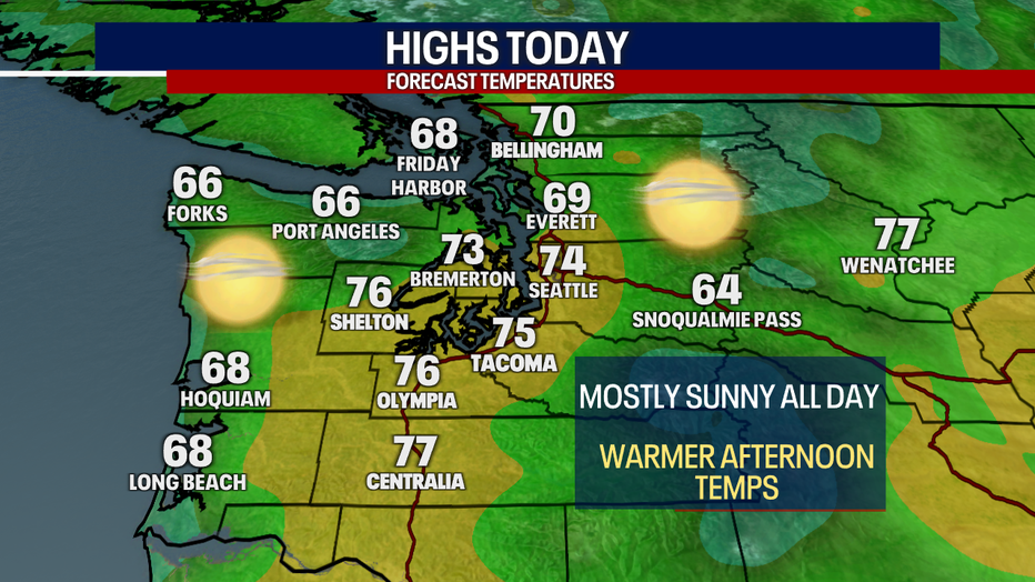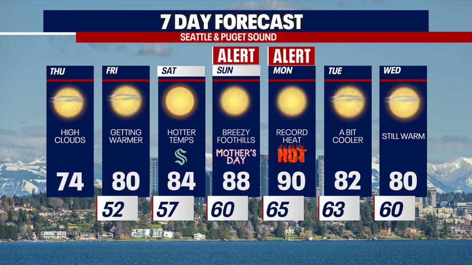 While sunshine is expected to be the main feature this week, there is a chance that some clouds impact Western Washington on Monday from a system approaching from the southeast. This could lower our current forecasted high temps on Monday (that wouldn't be a bad thing). We will continue to watch this as new model runs come in.