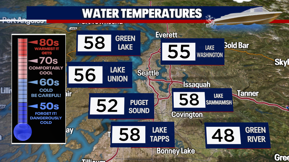 As temps soar this weekend, it is really important to remember that our area lakes, rivers, and the Puget Sound are all very cold. Water temps are still in the 50s this time of year, so wear a life jacket. Even great swimmers can struggle in water this cold.