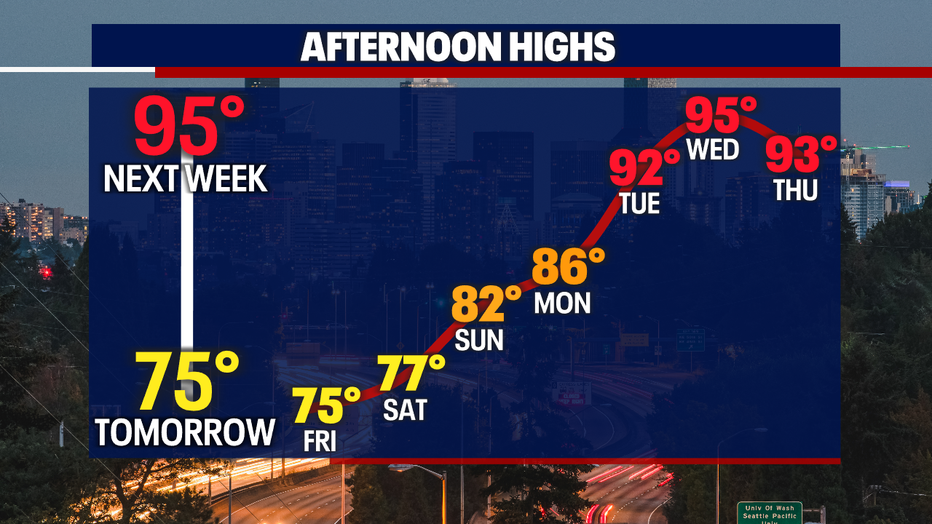 SEATTLE - Highs once again peaked in the 80s (81 degrees) along with dry conditions and comfortable wind speeds today. Cooler temperatures will arrive tomorrow, and highs return into the 70s. We'll wake up to thicker cloud cover, but it'll clear up in time for your commute home.