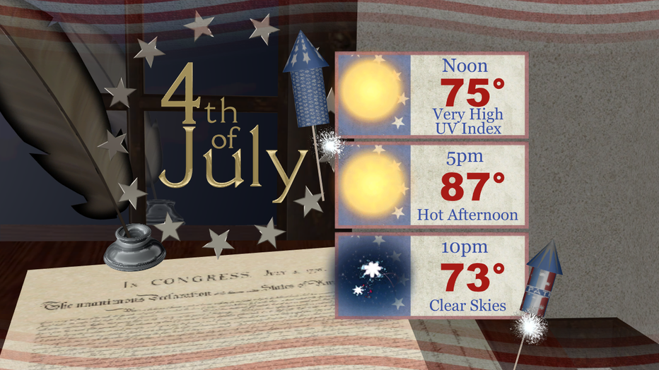 As we press forward, temperatures will remain in the 70s. However, as we hit Tuesday (Independence Day) we'll be turning up the heat! Temperatures will soar into the upper-80s (record high is 92 set back in 2015). Protect your skin because the UV index will be very high (burn time: 15-25 min). Here is your July 4th forecast: