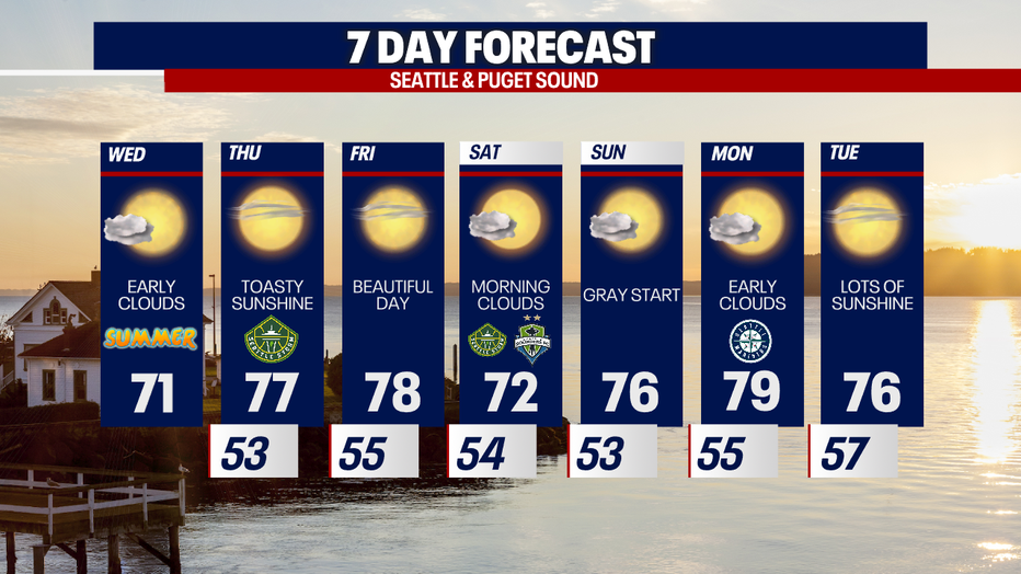 Tomorrow and Friday will be hotter as temps nudge closer to 80 degrees. While the day will start cloudy and murky for the coast, much of Puget Sound will enjoy sunshine from beginning to end.