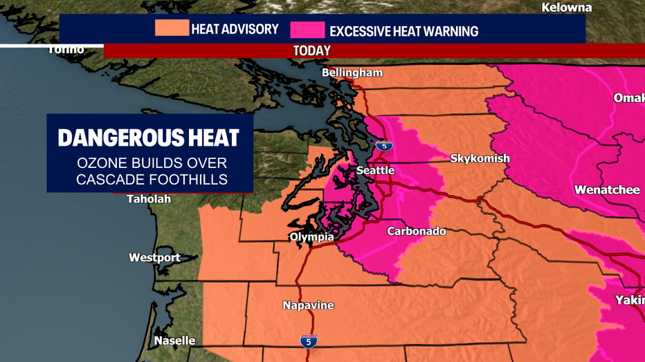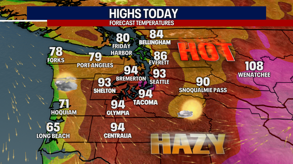 SEATTLE - It is a Weather Alert Day as temperatures once again climb into the mid-lower 90s. It'll be cooler along the coast as we wake up to thick fog! That will lift, and the sun will peak through this afternoon.