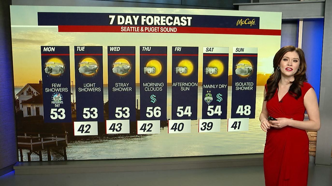 Highs for President's Day will be in the low to mid 50s. There will be a few scattered showers, but it looks more dry than wet. Breezy easterly gap winds will continue through the Cascades. Areas impacted by gap winds could see gusts up to 40 mph through this morning.