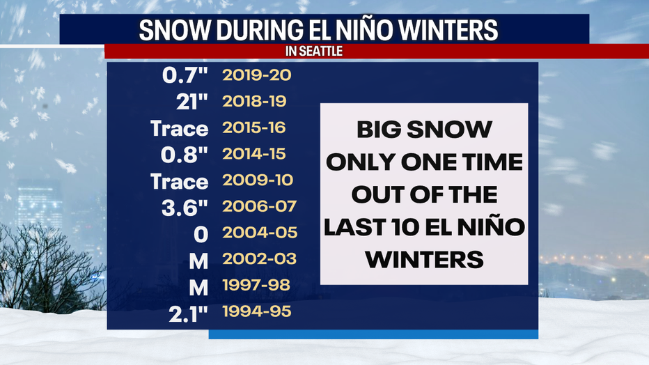 We are gearing up for an El Niño this upcoming winter season. Taking a look back on the last ten El Niño winters, we found an interesting pattern. While some snow is possible in these typically drier and warmer seasons, a big snow season in the lowlands is not as likely. Data is missing at Sea-Tac in the 1997-1998 and 2002-2003 years, but out of the other eight latest El Niño seasons, only one saw significant snowfall in the Puget Sound lowlands. The 2018-2019 season saw 21 inches.