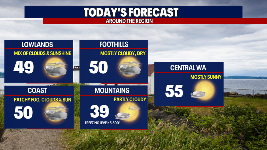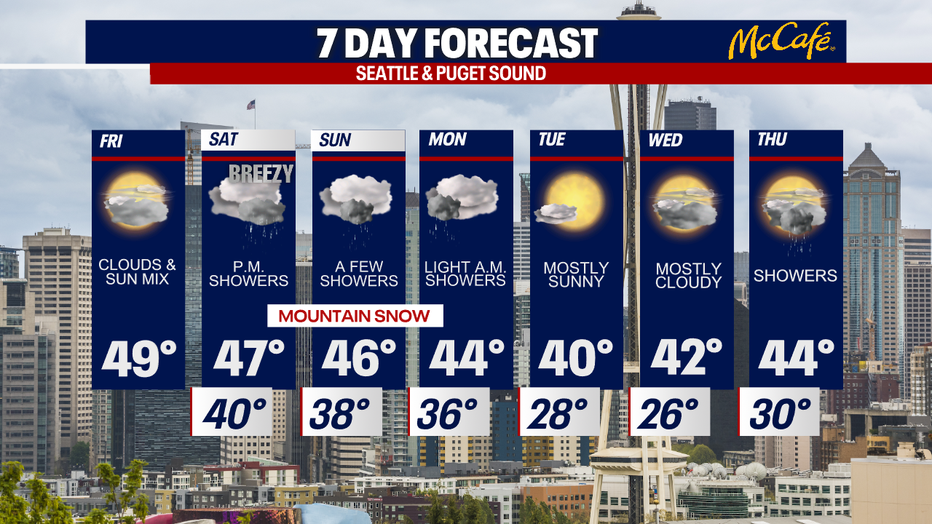 The Puget Sound area is ending the work week dry with a mix of clouds and sunshine. The strongest weather system of the month so far will move through the area Saturday into Sunday brining lowland rain and mountain snow.