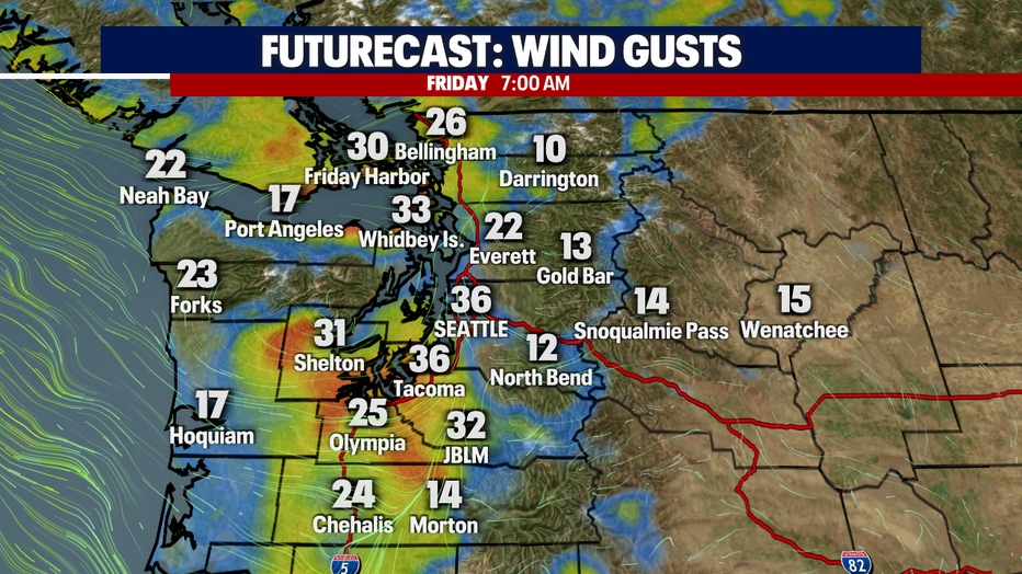 Winds will also be breezy especially along the coast Friday. Winds around the Puget Sound will be strongest in the morning. 20-25 mph.