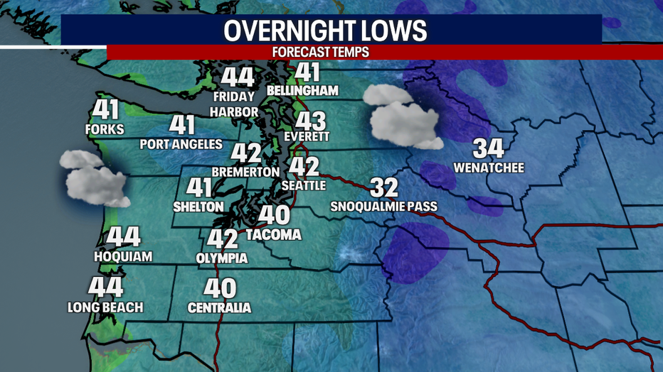 Highs Friday will be cooler as the cold front moves through Western Washington. Highs in the upper to mid 40s.