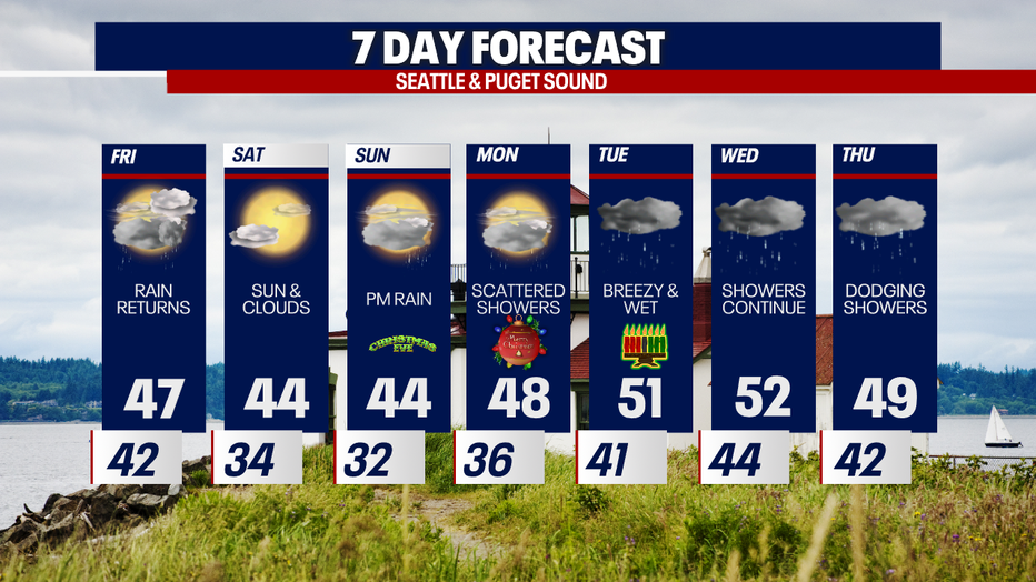 Dry time will return Saturday through most of Sunday. Rain returns to the lowlands later on Christmas Eve and some snow for the mountains. An atmospheric river set up is still on track for Monday through Wednesday.