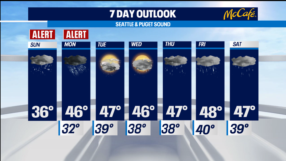 SEATTLE - Weather Alert Days continue Sunday and Monday as lowland snow continues across the lowlands of Western Washington.